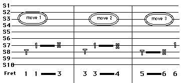 Move three places the slide after the thumb picks the string.